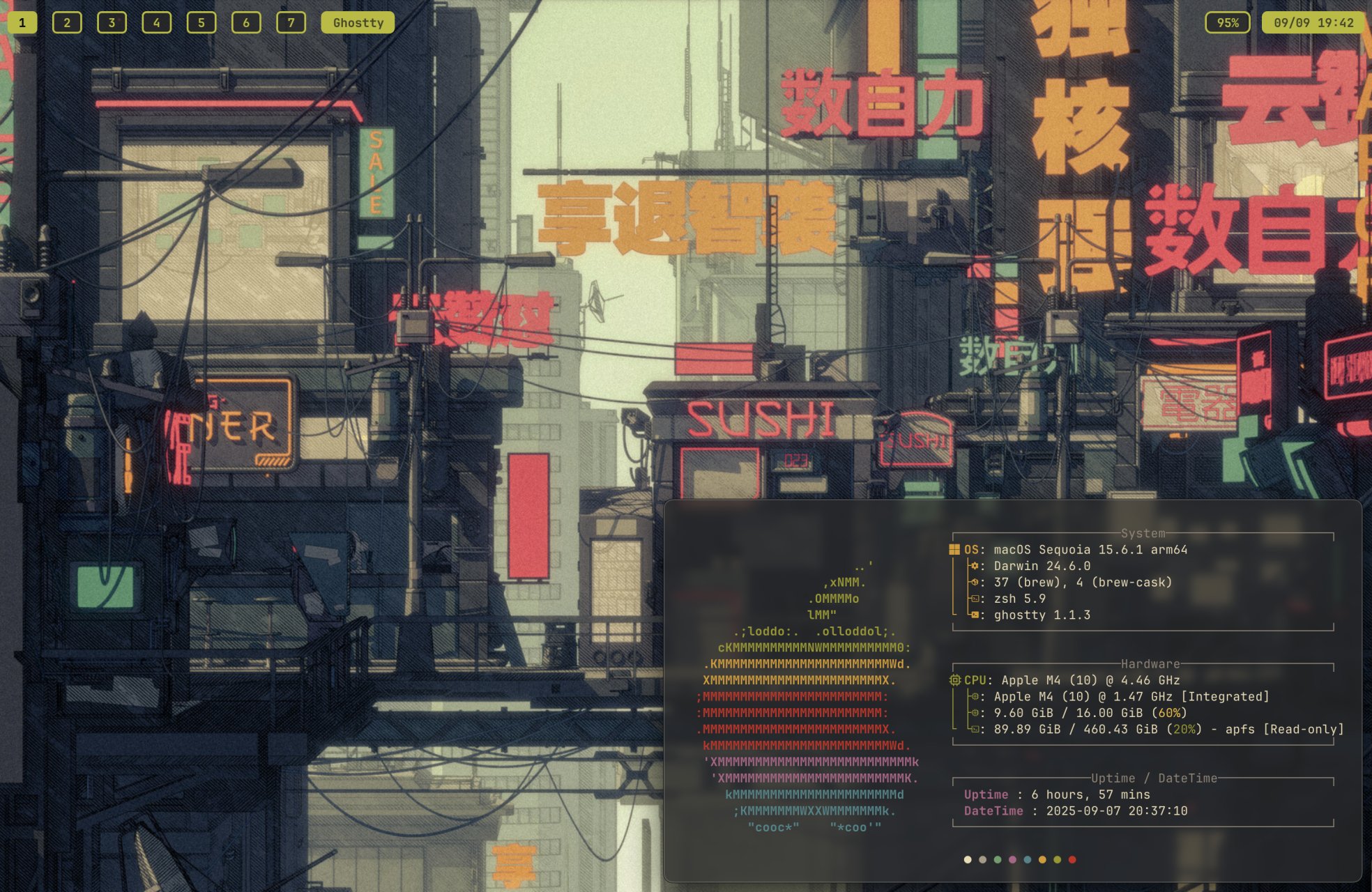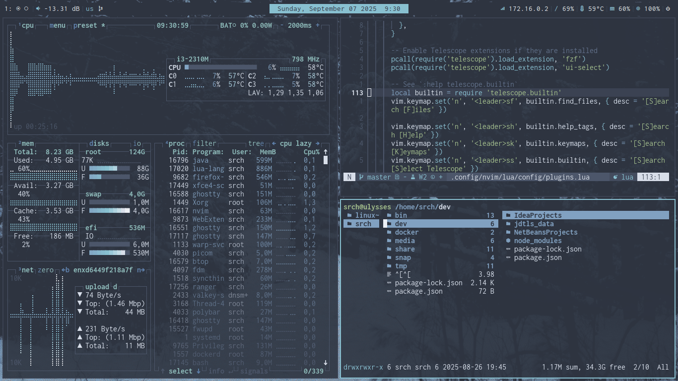 In the first and second images, you can see a terminal. Personally, I’m a fan of ghostty. It’s fast, lightweight, easy to configure and written Zig (i like zig :3).