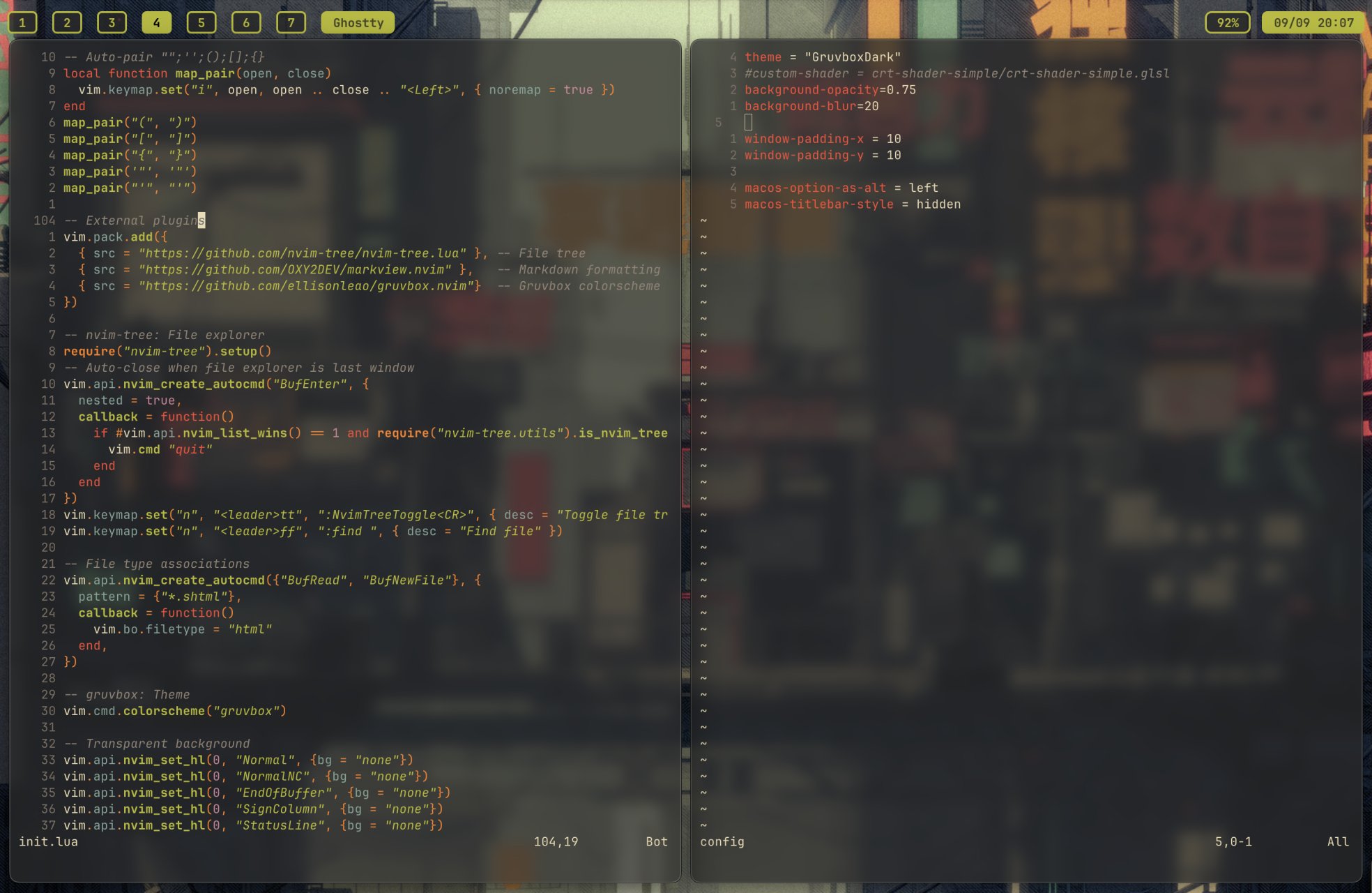I didn’t make any big changes to ghostty. I changed the colorscheme to gruvbox, removed the macos title bar, made the background transparent and added some blur.